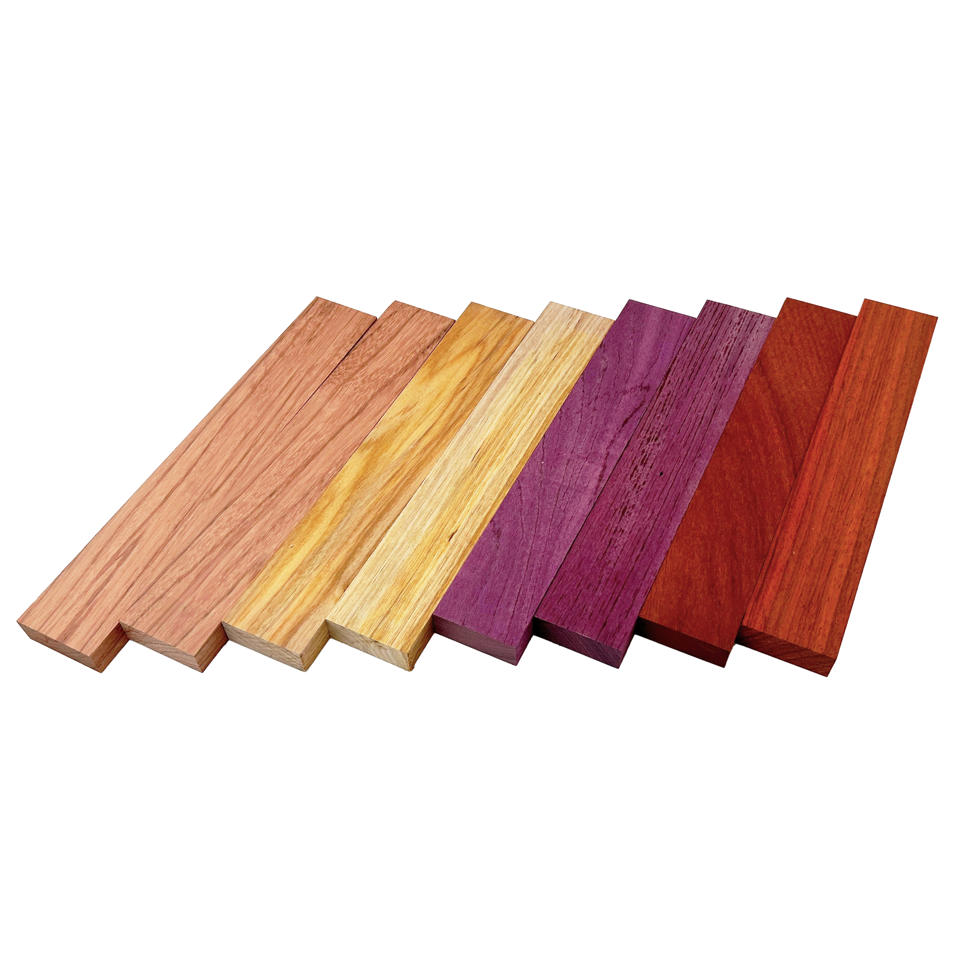 Exotic Colors Variety Pack - Red Zebrawood, Canarywood, Purpleheart, Padauk - 3/4" x 2" (8 Pcs)